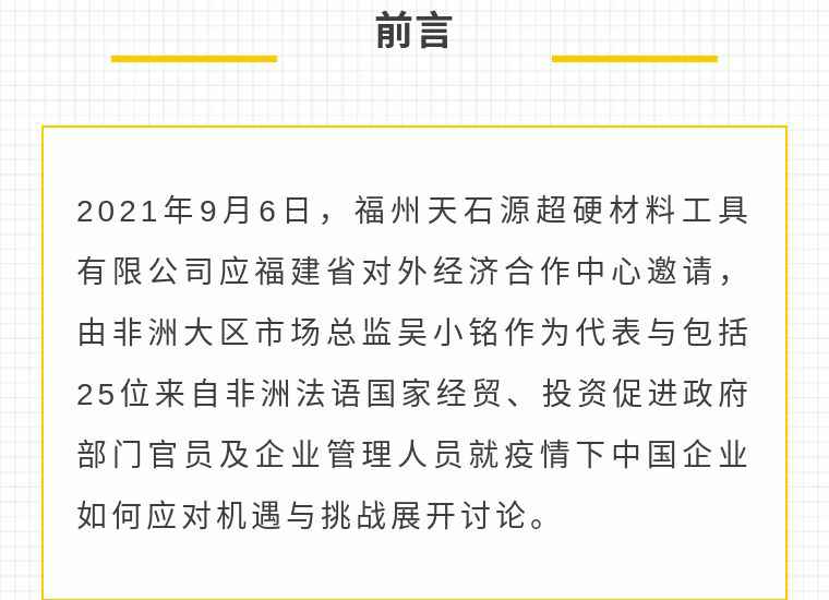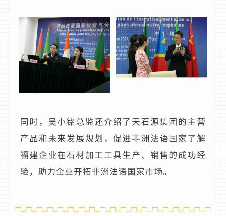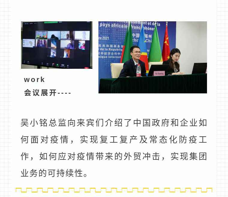 2021年9月6日,爱游戏最新官网-爱游戏(中国)应福建省对外经济合作中心邀请,由非洲大区市场总监吴小铭作为代表与包括25位来自非洲法语国家经贸、投资促进政府部门官员及企业管理人员就疫情下中国企业如何应对机遇与挑战展开讨论。